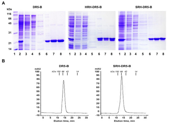 Yagolovich, A.V.; Artykov, A.A.; Isakova, A.A.; Vorontsova, Y.V.; Dolgikh, D.A.; Kirpichnikov, M.P.; Gasparian, M.E. Optimized Heterologous Expression and Efficient Purification of a New TRAIL-Based Antitumor Fusion Protein SRH–DR5-B with Dual VEGFR2 and DR5 Receptor Specificity. Int. J. Mol. Sci. 2022, 23, 5860. https://doi.org/10.3390/ijms23115860