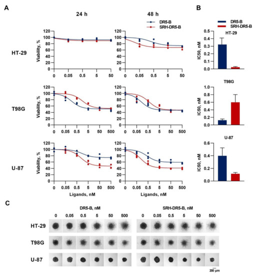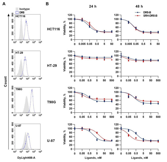 2.4. The Cytotoxic Activity of SRH–DR5-B in 2D and 3D Tumor Cell Models