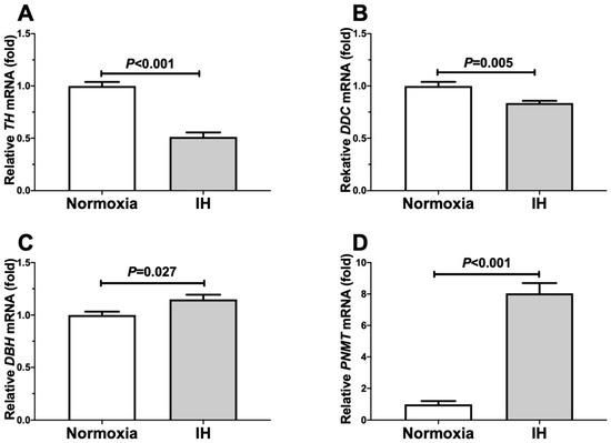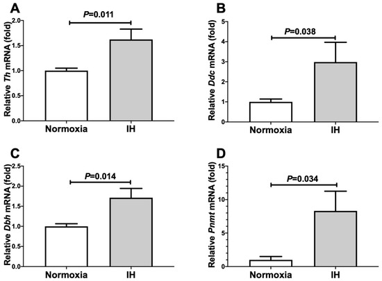 We exposed catecholamine-producing mouse Neuro-2a and human NB-1 neuroblastoma cells to normoxia or IH for 24 h. Following the IH treatment, we prepared cellular RNA and measured the mRNA levels of catecholamine biosynthesis enzymes such as tyrosine hydroxylase (Th), L-3,4-dihydroxyphenylalanine (DOPA) decarboxylase (Ddc), dopamine β-hydroxylase (Dbh), and phenylethanolamine N-methyltransferase (Pnmt) by means of a real-time reverse transcription-polymerase chain reaction (RT-PCR). We found that the mRNA levels of Th, Ddc, Dbh, and Pnmt were up-regulated by IH in mouse Neuro-2a cells (Figure 1).