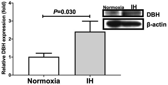 Relative protein expression of DBH in human NB-1 neuroblastoma cells subjected to IH. A representative immunoblot is shown in the right panel. The relative expression of DBH is arbitrarily presented. The DBH band densities were quantified using an image analysis and then normalized to β-actin, as measured in the same blot. Each bar represents the mean values of six independent experiments. The results are expressed as the mean ± SE in arbitrary units.
