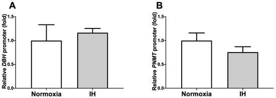 Promoter activities of DBH (A) and PNMT (B) in human NB-1 neuroblastoma cells. Reporter plasmids prepared by inserting the promoter fragments of DBH (−1018–+10) and PNMT (−600–+67) up-stream of a firefly luciferase reporter gene in a pGL4.17 vector were transfected into the NB-1 cells. After the cells were exposed to either IH or normoxia for 24 h, they were lysed, and the promoter activities of DBH and PNMT were measured. All data are presented as the mean ± SE of the samples of six independent experiments (n = 6). The statistical analyses were performed using Student’s t-test.