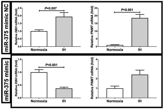 We considered a possible explanation that the IH-induced up-regulation of DBH and PNMT was controlled post-transcriptionally. Therefore, we searched for targeted miRNA using the MicroRNA.org program (http://www.microrna.org/microrna/home.do, 23 October 2021), which revealed that DBH and PNMT mRNAs had a potential target sequence for miR-375. There were no other miRNA candidates targeting both genes. We measured the miR-375 levels of IH-treated cells using real-time RT-PCR and found that the level was significantly lower than that of normoxia-treated cells (Figure 6: 0.371 ± 0.108 folds vs. normoxia, p = 0.022). There are several possible reasons as to why the level of miR-375 was decreased by IH; one is that the mRNA levels of some enzymes involved in miRNA biosynthesis/degradation are influenced by IH; another is that the level of miR-375 was specifically decreased by IH, either via decreased biosynthesis or enhanced degradation. We measured the endoribonuclease Dicer (DICER), which is involved in the biosynthesis of miRNAs [8,9], and found that its expression was unchanged by IH (Figure 6: p = 0.135). These results suggest that miR-375 plays a key role in the post-transcriptional regulation of the mRNA levels of DBH and PNMT. To investigate whether DBH and PNMT expression in IH is regulated by miR-375, miR-375 mimic and non-specific control RNA (miR-375 mimic NC) were introduced into NB-1 cells with IH/normoxia exposure, and the mRNA levels of DBH and PNMT were measured using real-time RT-PCR.