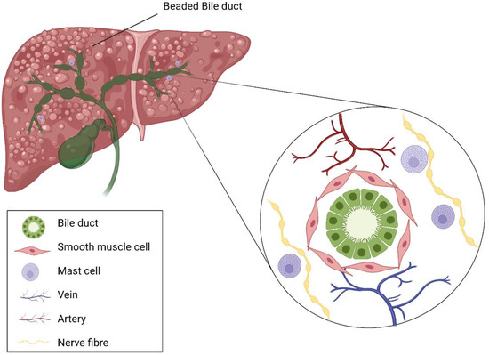 The location of mast cells within an inflamed liver. PSC/PBC livers share the pathological feature of extensive fibrosis. Beading of intra- and extra-hepatic bile ducts is a common feature in PSC and is due to collagen fibre deposition around the bile ducts, leading to compression. MCs have been observed to infiltrate areas of fibrosis and damaged bile ducts. Generally, MCs tend to associate with connective tissues found near hepatic arteries, veins, and bile ducts of the portal tracts. MCs reside close to vascular smooth muscle cells and may be involved in the regulation of the peribiliary vascular plexus along the intrahepatic biliary tree and in proximity to the nerve fibres around portal tracts. MC liver infiltration is significantly increased in immune-mediated cholangiopathies such as PSC and PBC.