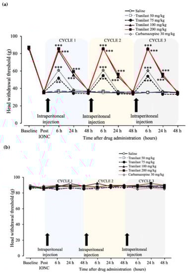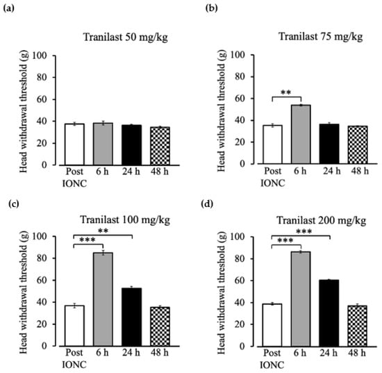2.3. The Effects of Tranilast in Regard to Mechanical Stimuli Post IONC Lasted up to 24 h in Comparison to Carbamazepine