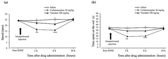 2.5. Rotarod Performance Was Unaffected in the Tranilast Group and Motor Coordination Deficits Were Confirmed in the Carbamazepine Group in IONC Rats