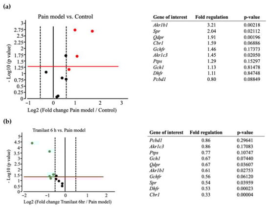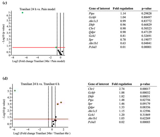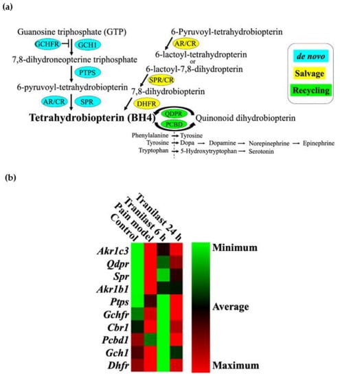 - Moore, B.J.; Islam, B.; Ward, S.; Jackson, O.; Armitage, R.; Blackburn, J.; McHugh, P.C. Repurposing of tranilast for potential neuropathic pain treatment by inhibition of sepiapterin reductase in the BH4 pathway. ACS Omega 2019, 4, 11960–11972. [Google Scholar] [CrossRef] [Green Version]