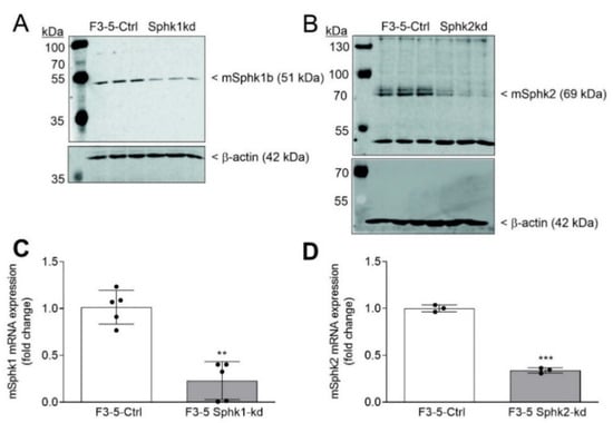 Stable mSphk1- and mSphk2-knockdown in F3-5 cells. F3-5 cells stably transduced with either an empty lentiviral vector (Ctrl) or a lentiviral vector transcribing shRNA targeting mSphK1 (Sphk1-kd), or mSphk2 (Sphk2-kd) mRNA, were incubated for 16 h in serum-free DMEM. Protein (A,B) and RNA (C,D) were extracted. Proteins were analyzed by immunoblotting using antibodies against mSphk1 (A, upper panel), mSphk2 (B, upper panel), or β-actin (A,B, lower panels). RNA was taken for quantitative PCR analysis using primers for mSphk1 (C) and mSphk2 (D), and 18S RNA for normalization. Results are expressed as fold change and are means ± S.D. (n = 5 or 3). ** p < 0.01, *** p < 0.001 considered statistically significant when compared to the control cells.