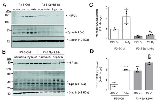 Knockdown (kd) cells were exposed for 6 h to normoxia (21% O2) or hypoxia (1% O2). In control (Ctrl) F3-5 cells, hypoxia typically upregulated Epo protein levels when compared to normoxia controls. This hypoxia effect was abolished in Sphk1-kd cells (Figure 2A), while it was upregulated in Sphk2-kd cells (Figure 2B). Notably, a band at 35–40 kDa is also detected by the anti-Epo antibody, which likely represents a higher glycosylated intracellular form of Epo [45]. HIF-2α, the key transcription factor regulating Epo transcription in hypoxia, was regulated in a similar manner, i.e., hypoxia-induced HIF-2α protein levels were reduced in Sphk1-kd, but upregulated in Sphk2-kd. Notably, HIF-2α was already increased in normoxic Sphk2-kd cells.