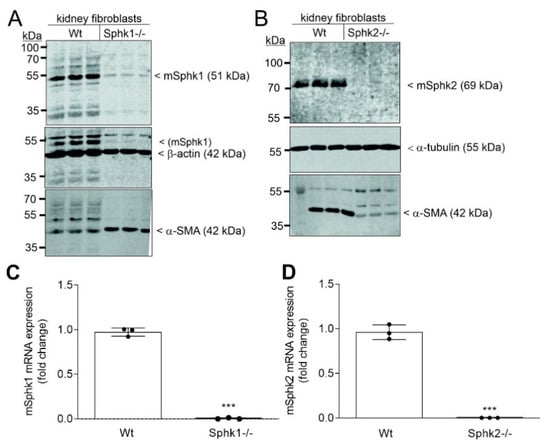 To confirm the results obtained with immortalized F3-5 cells, primary kidney fibroblasts were isolated from either wildtype (Wt) control C57BL/6, Sphk1−/−, or Sphk2−/− mice. The respective enzymes were completely lost in the respective cultures of primary cells (Figure 3A,B). All three cell isolations were positive for α-SMA demonstrating that the cells were of mesenchymal origin. Notably, compared to Wt fibroblasts, α-SMA protein was decreased in Sphk2−/− fibroblasts, but enhanced in Sphk1−/− fibroblasts, which confirms previous reports that Sphk2 deficiency downregulates the fibrotic phenotype of the cells [12,13,14], while Sphk1 deficiency enhances the fibrotic phenotype [16,29]. Knockout cells were also tested for cross-regulation of the remaining kinase (Figure S4). Sphk2−/− cells again showed an upregulation of Sphk1 (Figure S4) similar as seen in F3-5 cells, while Sphk1−/− expressed unaltered Sphk2 protein. Lipid quantifications revealed that only Sphk1−/− cells had reduced S1P and dihydro-S1P levels (Figure S5). Remarkably, Sphk2−/− had strongly increased Sph and dihydro-Sph levels, while S1P and dihydro-S1P were slightly increased, possibly by redirecting Sph to the Sphk1 reaction (Figure S5).