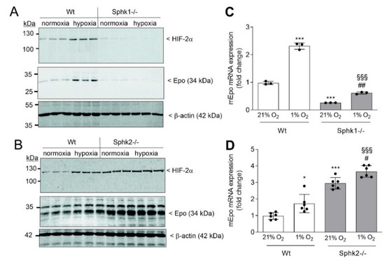 These cells were then exposed to hypoxia or normoxia, and HIF-2α and Epo protein levels were determined. Again, in Sphk1−/−, hypoxic induction of HIF-2α was lost (Figure 4A), while it was upregulated in Sphk2−/− cells (Figure 4B). A similar regulation was seen for Epo protein (Figure 4A,B, middle panels) and for Epo mRNA expression (Figure 4C,D).