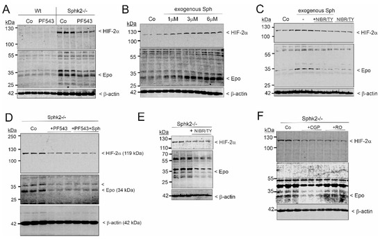 Exogenous sphingosine and the Sphk1 inhibitor PF543 affect HIF-2α and Epo protein levels in primary cultures of mouse fibroblasts. (A): Wildtype (Wt) and Sphk2−/− renal fibroblasts were incubated for 16 h with serum-free DMEM prior to stimulation for 24 h with 1µM PF543. (B) Wt fibroblasts were treated for 24 h with increasing concentrations of exogenous sphingosine. (C) Wt fibroblasts were treated for 24 h with 3 µM sphingosine in the absence (−) or presence of 10 µM each of NIBR-0213 plus TY52156. (D) Sphk2−/− renal fibroblasts were pretreated for 4 h with 1 µM of PF543 and then treated for 24 h with 3 µM sphingosine. (E) Sphk2−/− cells were treated for 24 h with 10 µM NIBR-0213 and TY52156. (F) Sphk2−/− cells were treated for 24 h with 100 nM CGP41251 or 1 µM RO-318220. Protein was analyzed by immunoblotting using antibodies against HIF-2α, Epo, or β-actin. Corresponding bands were evaluated by using Image Studio Lite software (version 3.1, LI-COR Biosciences, Lincoln, NE, USA), normalized to β-actin, and are presented in Figure S9.