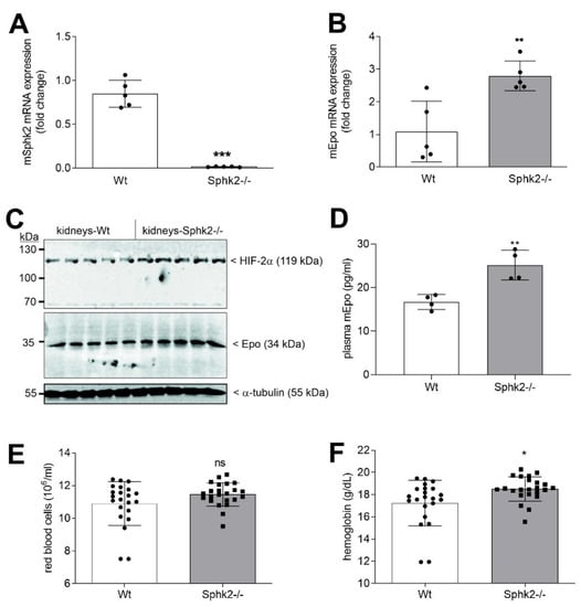 Epo mRNA and protein levels in kidneys from Wt and Sphk2−/− mice under normoxic conditions. Kidneys from C57BL/6 (Wt) mice and Sphk2−/− mice were taken for RNA (A,B) or protein (C) extraction. mRNA was analyzed by qPCR using primers for mSphk2 (A) and mEpo (B), and mL28 mRNA for normalization. ΔΔCt values were calculated and results show the fold change compared to the Wt controls and are means ± S.D. (n = 5), ** p < 0.01, *** p < 0.001 considered statistically significant when compared to the Wt control samples. (C) Protein was analyzed by immunoblotting using antibodies against HIF-2α (top panel), Epo (middle panel), and α-tubulin (bottom panel). Corresponding bands were evaluated by Image Studio Lite software (version 3.1, LI-COR Biosciences, Lincoln, NE, USA), normalized to α-tubulin, and are presented in Figure S11. (D) Blood was collected from Wt or Sphk2−/− mice and plasma Epo was quantified by ELISA. Results are depicted in pg/mL and are means ± S.D. (n = 4), ** p < 0.01 was considered statistically significant when compared to the Wt samples. (E,F) Blood from Wt and Sphk2−/− mice was analyzed for the number of red blood cells (E) and hemoglobin (F) as described in Section 4. Results are means ± S.D. (n = 22 for Wt and 23 for Sphk2−/−). * p < 0.05 compared to the Wt mice.