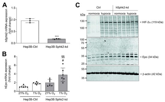 hSphk2 knockdown affects hypoxia-induced HIF-2α and Epo protein expression in the human hepatoma cell line Hep3B. Hep3B cells were transduced with a control shRNA construct (Ctrl) or with a hSphk2 shRNA construct (hSphk2-kd), and stably selected cells were either exposed for 6 h to normoxia (21% oxygen) or hypoxia (1% oxygen). (A,B) mRNA was analyzed by qPCR using primers of hSphk2 (A) and hEpo (B), and 18S (for hSphk2) and hL28 (for Epo) mRNA for normalization. ΔΔCt values were calculated and normalized to 18S or L28, respectively. Results are expressed as fold change compared to normoxic control cells and are means +/− S.D. (n = 6), *** p < 0.001 was considered statistically significant when compared to the normoxic control; # p < 0.05 compared to the normoxic hSphk2-kd cells; §§ p < 0.01 compared to the hypoxic Ctrl cells. (C) Protein was analyzed by immunoblotting using antibodies against HIF-2α (C, top panel), Epo (C, middle panel), or β-actin (C, bottom panel). Corresponding bands were evaluated by using Image Studio Lite software (version 3.1, LI-COR Biosciences, Lincoln, NE, USA) and normalized to β-actin and are presented in Figure S12.