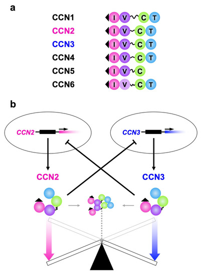 Despite such striking structural and behavioral similarities, these two family members appear to functionally counteract each other and negatively regulate the gene expression of the other in a yin–yang manner (Figure 1b) [46,47,48]. Namely, investigation with kidney mesangial cells indicated that CCN3 markedly downregulated CCN2 production, leading to the blockade of the accumulation of extracellular matrix caused by CCN2. Moreover, TGF-β treatment reduced CCN3 expression, while inducing CCN2 in those cells and human dermal fibroblasts. The opposing biological effects of CCN2 and CCN3 and mutual repressive regulation were also observed in chondrocytes [7]. In this review, recent findings regarding the mechanism and biological significance of the intimate interactions between CCN2 and CCN3 are introduced in a brief but comprehensive fashion.