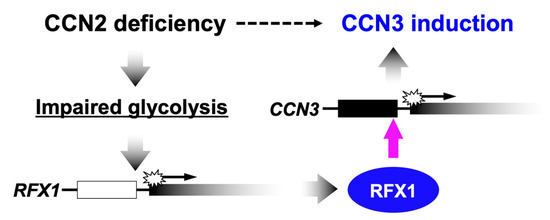 Unlike the molecular functionalities, temporospatial emergence of CCN2 and CCN3 in a yin–yang fashion does not result from their molecular interactions. Where and when CCN3 is, CCN2 may not be produced, and vice versa. In order to firmly support this situation, a mutual negative regulatory system is quite effective, and is actually furnished in our cells. Several reports in the past indicated that overexpression or exogenous addition of either CCN2 or CCN3 attenuated the gene expression of the other in several types of cells [7,46]. Consistent with these findings, highly elevated expression of CCN3 was observed in murine Ccn2-null chondrocytes [7]. However, the molecular mechanisms of these regulatory systems remained totally unclear for a long time. Recently, a genetic mechanism that mediates the negative regulation of CCN3 by CCN2 was uncovered in chondrocytes. In those cells, CCN2 depletion caused severe ATP deficiency. Metabolomic and transcriptomic analyses revealed that metabolic intermediates of glycolysis and the gene expression of a series of enzymes that catalyze the reactions therein were both attenuated in Ccn2-null chondrocytes. In contrast, no appreciable changes were observed in the mitochondrial membrane potential in those cells. These findings strongly indicate that CCN2 deficiency leads to impaired glycolysis. [85,86]. In relation to this metabolic impact of CCN2 deficiency, recent studies revealed that CCN3 expression was strongly enhanced at a transcriptional level by impaired glycolysis [87]. Indeed, CCN3 expression was markedly induced by biochemical inhibition of two different enzymes involved in the glycolytic pathways, as well as by glucose starvation in chondrocytic cells. Subsequent study identified regulatory factor binding to the X-box (RFX) 1 as a transcription factor that binds to the enhancer in the CCN3 proximal promoter region and mediates this metabolic gene regulation (Figure 2) [88]. Therefore, in chondrocytes, glucose metabolism is a central mediator of the repressive regulation of CCN3 by CCN2. However, in contrast with the negative regulatory machinery of CCN3 by CCN2, the mechanism of how CCN3 represses CCN2 is still poorly understood.