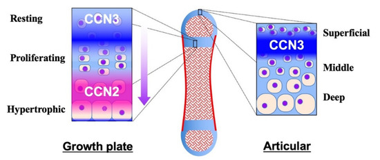 The yin–yang behavior of CCN2 and CCN3 during tissue development, maintenance and regeneration is typically found in the skeletal system. Roughly speaking, CCN2 promotes these processes, whereas CCN3 acts as a regulator or repressor therein, emerging and disappearing in turn. Most bones constituting our skeleton are formed through an integrated process called endochondral ossification. In this process, the bone anlage is first formed as cartilage. Thereafter, chondrocytes grow bones as cartilage, following a series of procedures which develop the growth plate therein (Figure 3, left panel). At the earliest stage, CCN3 is expressed in this avascular prototype of the bone with its higher expression levels inside [97]. Owing to the poor nutrition supply, CCN3 expression at this stage is the highest in the central region. CCN3 exerts angiogenic activity to lead blood vessels inside, which results in ossification center formation, the beginning of endochondral ossification. The CCN3 accumulated at the ossification center stays with hypertrophic chondrocytes around [98], which may assist those cells in ceasing proliferation. In the regions furthest from the vascular invasion, CCN3 expression in immature chondrocytes is retained at high levels, keeping the cells quiescent as resting chondrocytes. From this region towards the ossification center, CCN3 expression gradually diminishes, allowing them to proliferate as proliferating chondrocytes [7]. As CCN3 decreases, CCN2 increases in turn, because of the improved glycolysis supported by the nutrition infiltrating from the blood vessels. CCN2 accelerates both proliferation and differentiation as a communication network factor to grow the cartilage, and its production reaches a peak in the highly differentiated pre-hypertrophic chondrocytes, where CCN3 is not actively produced [7]. Finally, around the site of vascular invasion, terminally differentiated hypertrophic chondrocytes disappear, forming matrix vesicles, on which osteoblasts accumulate mineralized crystals to build bone tissues [97]. In spite of their differential gene expression, CCN2 and CCN3 encounter each other during the proliferative stage [7]. It is suspected that the direct binding of CCN2 to CCN3 [42] may antagonize the antiproliferative effect of CCN3, whereas the differentiating effect of CCN2 may be also attenuated, which would promote chondrocytes from resting to proliferative stages.