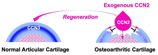 In general, damaged articular cartilage hardly regenerates without therapeutic intervention. Nevertheless, CCN2 was found to promote the regeneration of damaged articular cartilage in rat osteoarthritis models [101,102]. Namely, exogenously applied CCN2 promotes the proliferation and differentiation of the remaining cells; furthermore, this CCN family member strongly represses the production of CCN3 through the metabolic regulatory system introduced in a previous section (Figure 4) [7,88]. As a consequence of this yin–yang regulation, articular chondrocytes are released from the quiescent stem-cell stage and are engaged in cartilage reconstruction encouraged by the molecular function of CCN2. As such, this mutual regulatory system is also useful for maintaining and recovering the integrity of the permanent cartilage in synovial joints.