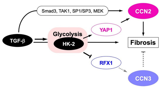 Metabolic yin–yang regulation of CCN2 and CCN3 during fibrotic disorder development. TGF-β signal stimulates CCN2 both directly through specific transcription factors, including Smad3, TGF-β activated kinase 1 (TAK1), specificity protein (SP) 1/SP3 and mitogen-activated protein kinase (MAPK) -extracellular signal regulated kinase (ERK) kinase (MEK), and indirectly through the activation of glycolysis by accumulating hexokinase (HK)-2, which is mediated by yes-associated protein (YAP) 1. Glycolysis activation by TGF-β through HK-2 contrarily represses RFX1 expression, resulting in the repression of antifibrotic CCN3 production. Smad-independent negative regulation of CCN3 by TGF-β observed in nucleus pulposus cells could occur through this metabolic pathway. Finally, CCN2 protein promotes fibrosis in collaboration with TGF-β.
