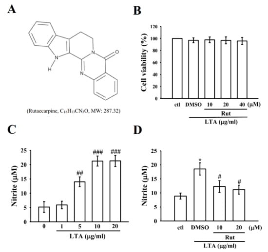 Effects of lipoteichoic acid (LTA) and rutaecarpine (Rut) on cell viability and nitric oxide (NO) production in RAW 264.7 cells. (A) Chemical structure of rutaecarpine. (B) Cells were treated with Rut (10–40 μM) for 20 min and then treated with LTA (10 μg/mL) for 24 h. Cell viability was assessed as described in the Methods section. Cells were treated with (C) various concentrations of LTA (1–20 μg/mL) for 24 h (D) 0.1% dimethyl sulfoxide (DMSO) or Rut (10 and 20 μM) for 20 min and then treated with LTA (10 μg/mL) for 24 h to measure NO (nitrite) by using a Griess reagent. Data are presented as the means ± SEM (n = 4). * p < 0.05, compared with the control group; # p < 0.05, ## p < 0.01, and ### p < 0.001, compared with the LTA group.