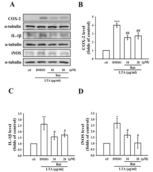 Effects of Rut on the expression of cyclooxygenase-2 (COX-2), interleukin-1 beta (IL-1β), and inducible nitric oxide synthase (iNOS) in LTA-stimulated RAW cells. (A–D) Cells were pretreated with Rut (10 and 20 μM) for 20 min and then stimulated by LTA (10 μg/mL) for 24 h. The levels of (B) COX-2 (C) IL-1β and (D) iNOS protein expression were evaluated as described in the Methods section. Data are presented as the means ± SEM (n = 4); * p < 0.05, ** p < 0.01, and *** p < 0.001, compared with the control group; # p < 0.05 and ## p < 0.01, compared with the LTA group.