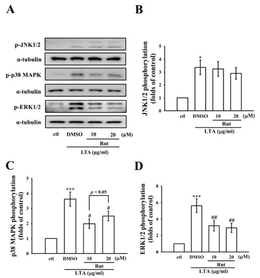 Influence of Rut on LTA-induced phosphorylation of c-Jun NH2-terminal kinase (JNK), p38 mitogen-activated protein kinase (p38 MAPK), and extracellular signal-regulated kinase (ERK) in RAW cells. (A–D) Cells were treated with 0.1% DMSO or Rut (10 and 20 μM) for 20 min, followed by LTA (10 μg/mL) for 30 min, and the phosphorylation of (B) JNK1/2 (C) p38 MAPK and (D) ERK1/2 were evaluated by the immunoblotting assay as described in the Methods. Data are presented as the means ± SEM (n = 4). * p < 0.05 and *** p < 0.001, compared with the control group; # p < 0.05 and ## p < 0.01 compared with the LTA group.