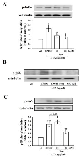 Effects of Rut, BAY11-7082, and MG-132 on IκBα and NF-κB p65 phosphorylation in LTA-stimulated RAW cells. (A) Cells were treated with 0.1% DMSO, or Rut (10 and 20 μM) for 20 min, followed by LTA (10 μg/mL) for 30 min. (B,C) Cells were treated with 0.1% DMSO, BAY11-7082 (10 μM), or MG-132 (50 μM) for 20 min, followed by LTA (10 μg/mL) for 30 min. The phosphorylation of (A) IκBα and (B,C) p65 were determined by immunoblotting. Data are presented as the means ± SEM (n = 4). * p < 0.05 and *** p < 0.001, compared with the control group; # p < 0.05 and ## p < 0.01, compared with the LTA group.