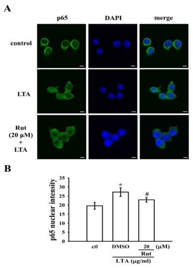 Effects of Rut on LTA-induced NF-κB p65 nuclear translocation in RAW cells. Cells were treated with 0.1% DMSO, Rut (20 μM) for 20 min, followed by LTA (10 μg/mL) for 30 min. (A) The immunofluorescence staining analysis was performed with an anti-p65 antibody and FITC-conjugated anti-rabbit IgG antibody (green). 4′,6-diamidino-2-phenylindole (DAPI) was used to label the nuclei (blue). The images were captured by confocal microscopy (scale bar = 5 μm). (B) Data were graphed by pooling multiple images, with each individual data point corresponding to the mean fluorescence intensity of each individual cell nucleus. Data are presented as the means ± SEM (n = 4). * p < 0.05, compared with the control group; # p < 0.05, compared with the LTA group.