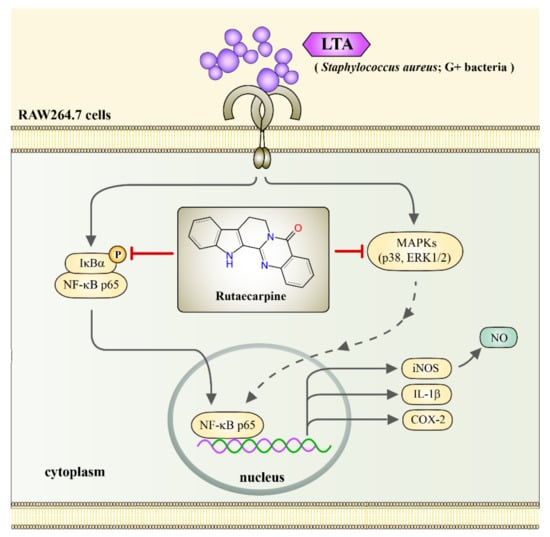 Although non-steroidal anti-inflammatory drugs (NSAID) have been used to treat joint and spine-related inflammatory pain, but still they create serious side effects including gastrointestinal bleeding, gastritis, ulceration, hemorrhage, and even death []. Due to the severe side effects of synthetic pharmaceutical drugs, researchers have paid more attention to searching for nutraceutical compounds as an alternative therapeutic and preventive approach. Nutraceuticals can be delivered in the form of dietary supplements or functional food, supplying beneficial effects in addition to the essential nutritional l components. A recent study has shown the beneficial effects of nutraceutical ingredients on boosting immune functions [], such as enhancing the infection response mechanism, boosting immunomodulatory activity, and contributing to reducing the impacts of autoimmune disorders and hypersensitivity. Nutraceuticals have also been shown to exert lipid-lowering, anti-inflammatory, anticancer, and antioxidant activity [,]. Herbs and other natural plant resources have been regarded as the major sources of several drugs. For thousands of decades, in almost all regions of the world, herbal medicines have been used for treating diseases and disorders. Various herbal formulas are appealed to be effective in treating diseases, however, in most cases the active components in these herbal combinations are indefinite and the mechanisms of action are ambiguous. Therefore, researchers devotedly work in the field of the identification of new components with biological activities. Rutaecarpine (Rut) is a venerable example of a biologically active constituent from natural resources. Rutaecarpine (Figure 1A, 8,13-dihydroindolo-[2’,3’:3,4]-pyrido [2,1-b] quinazolin -5(7H)-one), is one of the fascinating indolopyridoquinazoline alkaloids isolated from Evodia rutaecarpa. Studies have demonstrated that rutaecarpine own broad biological and pharmacological properties, such as diuresis, perspiration, uterotonic action, improvement of cerebral functions, antinociception, inhibition of potassium cyanide (KCN)-induced anoxia, specific 2,3,7,8-tetrachlorodibenzo-p-dioxin binding, thermoregulatory, and anti-obesity [,]. Due to the beneficial and therapeutic potential of Rut, our previous study examined the underlying molecular mechanisms for the antiplatelet aggregatory effects of this compound. With these effects, a study showed that Rut has an antinociceptive activity that was advocated to be arbitrated by anti-inflammatory action []. Nevertheless, the nature of the anti-inflammatory activity of Rut has not been characterized yet. In this milieu, we have investigated the anti-inflammatory mechanism of Rut in bacterial LTA-stimulated macrophages.
