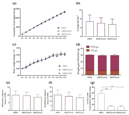 Food intake (g and Kcal) and spontaneous physical activity (average distance per day) were not different in the three groups during the 12 weeks (Figure 1a,b), as well as body weight changes and weight gain (assessed as fat mass and fat-free mass) (Figure 1c,d). Similarly, no difference was observed in the percentage of mesenteric and epididymal adipose tissues relative to the total fat mass (Figure 1e,f). Nevertheless, the linoleic acid (C18:2 n-6)/α-linolenic acid (C18:3 n-3) (LA/ALA) ratio in the mesenteric adipose tissue was significantly decreased in both linseed supplementation groups (HFD-LS-O and HFD-LS-E) compared with the HFD group (Figure 1g).