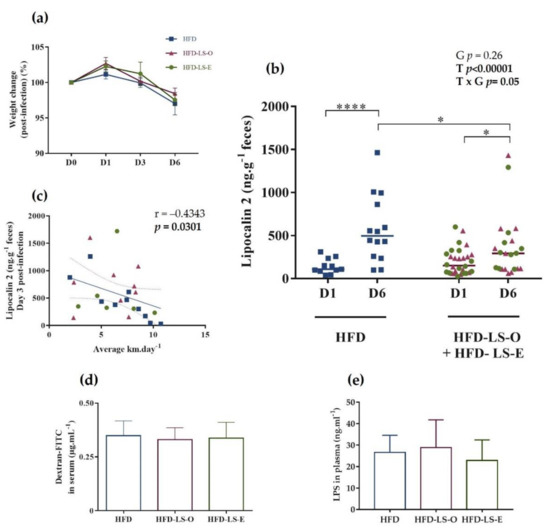 Weight change (%) after the oral challenge with the AIEC strain LF82 (a). Fecal lipocalin-2 concentration (µg·g−1 feces) at day 1 (D1) and D6 post-challenge (b), and correlation between lipocalin-2 concentration (µg·g−1 feces) at D3 post-challenge and mean wheel running distance (km) per day (c) in the three groups. Intestinal permeability was assessed by measuring FITC-dextran 4 kDa in the serum 5 h after intragastric administration of 7.5 mg FITC-dextran (n = 16 mice/group) at week 12, before the AIEC challenge (d). Plasma concentration (ng·mL−1) of active LPS 7 days post-AIEC pathobiont challenge (e). HFD-LS-O: pink triangles; HFD-LS-E green circles. * p < 0.05, **** p < 0.0001.