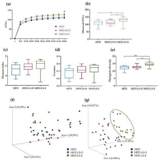 Mucosa-associated microbiota composition analyzed by 16S rRNA gene sequencing in DNA samples (Illumina MiSeq system) from HFD (n = 14), HFD-LS-O (n = 15) and HFD-LS-E (n = 15) colon samples collected at day 7 after oral challenge with the AIEC strain LF82. Operational taxonomic units (OTUs) with a rarefaction depth of 6884 sequences (a), observed OTUs (b), Shannon index (c), evenness (d), phylogenic diversity (e), weighted (f), and unweighted Unifrac analysis (g). * p < 0.05, ** p < 0.01, and *** p < 0.001.