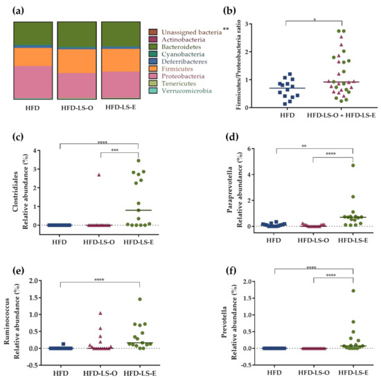 Composition of the mucosa-associated microbiota. Phylum distribution (%) (a), Firmicutes/Proteobacteria ratio (b), and relative abundance (%) of specific bacterial species in the mucosa-associated microbiota: Clostridiales (c), Paraprevotella spp. (d), Ruminococcus (e), and Prevotella (f). Colon samples from HFD (n = 14), HFD-LS-O (n = 15), and HFD-LS-E (n = 15) mice collected at day 7 post-challenge with the AIEC strain LF82. * p < 0.05, ** p < 0.01, *** p < 0.001, **** p < 0.0001.
