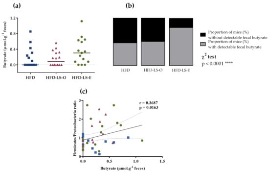 Concerning the abundance of specific microbiota phyla in the colon mucosa, Firmicutes tended to increase (p = 0.064) in both supplemented groups (HFD-LS-O and HFD-LS-E) (Figure 4a). Compared with the HFD group, linseed supplementation increased the Firmicutes/Proteobacteria ratio (p = 0.03) (Figure 4b). The analysis of composition of microbiomes (ANCOM) highlighted significant group differences for specific mucosa-associated microbiota species (Figure 4c,f). Indeed, in the HFD-LS-E group, the relative abundance of Clostridiales spp., Paraprevotella spp., and Prevotella spp. was significantly increased compared with the HFD and HFD-LS-O groups (p < 0.05) (Figure 4c,d,f) and that of Ruminococcus spp. compared with the HFD group (p < 0.05) (Figure 4f). SCFAs produced by the microbiota were quantified in fecal samples. No difference was found among groups concerning acetate, butyrate, propionate, and total SCFAs concentrations (Table 1). Butyrate, a major SCFA (due to its fermentative activity and beneficial effects at the intestinal level), tended to increase only in the HFD-LS-E group (Figure 5a), in line with the observed increased percentage of SCFA-producing Firmicutes in this group. When only mice in which fecal butyrate could be detected were considered, their percentage was significantly higher in the HFD-LS-E group (p < 0.0001) (Figure 5b). Furthermore, the level of fecal butyrate was positively correlated (p = 0.0163) with the mucosa-associated Firmicutes/Proteobacteria ratio (Figure 5c).