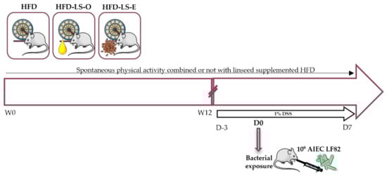 Study protocol. Eight-week-old mice were randomly divided in three groups that performed voluntary wheel running: HFD (high-fat diet, n = 16), HFD-LS-O (linseed oil-supplemented-HFD, n = 16), and HFD-LS-E (extruded linseed-supplemented-HFD, n = 16). The distance covered by wheel running was recorded continuously for 12 weeks. At the end of week 12 (W12), 1% dextran sulfate sodium (DSS) was added in the water of mice and after 3 days, mice were orally challenged with the adherent-invasive E. coli (AIEC) strain LF82 (once) and euthanized at day 7 after the challenge. Pair-feeding was performed during the first 12 weeks.