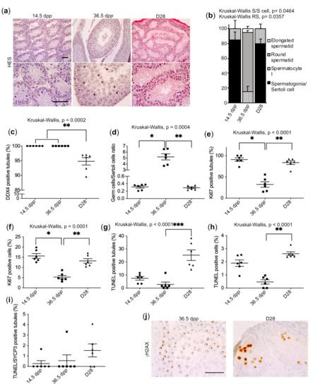 As previously described [16], rat prepubertal testicular tissues were cultured on agarose gels for 28 days (D28), at which time round spermatids should be present in seminiferous tubules. In order to characterize and identify the origin of the meiotic arrest in in vitro cultured rat prepubertal testicular tissues, histological and immunohistochemical analyses were first performed and compared to age-matched in vivo controls (36.5 dpp) and prepubertal in vivo controls (14.5 dpp). In seminiferous tubule sections of in vivo rat testes, all the expected stages of spermatogenesis were observed, with meiotic germ cells present in the adluminal compartment of seminiferous tubules at 36.5 dpp. (Figure 1a,b). In sections of the D28 cultured tissues, an early meiotic arrest at the spermatocyte I stage was observed. The tubules remained quite empty and few spermatocytes I were observed (Figure 1a,b). The immunolabeling of DDX4, a protein expressed in the germline and involved in germline integrity, confirmed that the germ cell content was decreased after organotypic culture, with the presence of Sertoli cell-only tubules and a decrease in the germ cells/Sertoli cells ratio compared to age-matched in vivo controls. While a lower number of germ cells per tubule was observed in cultured tissues compared to the age-matched control, the number of Sertoli cells per tubule was similar between the two conditions (Figure 1c,f, Figure S1a–c,f). In cultured tissues, the nuclei of some germ cells appeared pyknotic. However, the germ cells/Sertoli cells ratios were similar between D28 cultured tissues and 14.5 dpp immature testes (Figure 1d, Figure S1a–c).