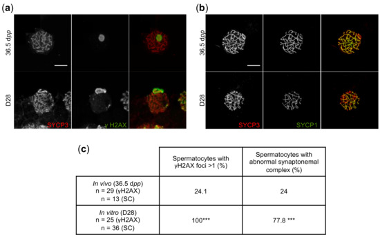 Immunofluorescence staining of meiotic spread preparations from D28 cultured tissues and 36.5 dpp controls. (a,b) γH2AX (a), SYCP1 (b), and SYCP3 (a,b) immunostaining. The upper and lower rows show a representative pachytene spermatocyte at 36.5 dpp and at D28, respectively. Scale bar: 10 μm, Magnification: ×630, Zoom 4. (c) Average percentage of spermatocytes with more than one γH2AX foci and with abnormal synaptonemal complex at 36.5 dpp (in vivo controls) and at D28. Cells were obtained from at least three different rats/culture repeats. For statistical analyses, a Chi2 test was applied *** p < 0.0001. Dpp—Days post-partum; SC—synaptonemal complex.