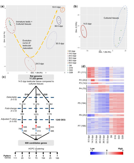 Transcriptomic analyses of in vitro and in vivo testicular tissues. (a) Scatter plot representing the position of each sample along the first two dimensions. Each point represents the average expression level of transcripts, one dot per replicate. The variability between samples is mainly explained by their age of development (Dimension 1, 84.8%). The different clusters, represented by colored circles, highlight the distance between each group of transcriptomes. An evolution curve of the transcriptome of maturing testicular tissues is represented in yellow. (b) PCA analysis conducted on the red dotted circle is shown in panel A, corresponding to cultured tissues and 14.5 dpp immature testes. The variability between groups is mainly explained by the origin of the tissue (in vivo vs. in vitro). All the in vitro-matured tissues display similar transcriptomic profiles. (c) Flowchart summarizing the filtration and clustering strategies. The numbers below the cluster ID indicate the genes falling into each cluster. (d) A false-color heatmap summarizes the seven patterns defining the global concentrations for transcripts across the entire sample set. Each line corresponds to a gene and each row to the mean expression value of a replicate. P1 to P7 refer to the number of patterns, followed by the number of genes included in each pattern in parenthesis. A color scale is shown for standardized values in RPKM, per million mapped reads. n = 3. Dpp—days post-partum; HCPC—hierarchical clustering on principal components; RPKM—reads per kilobase of transcript.
