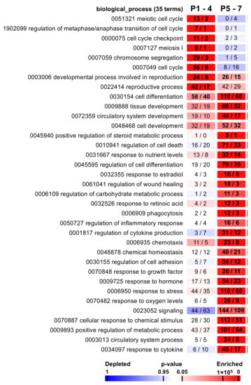 In order to investigate the molecular pathways involved in this defective maturation process, we performed a functional analysis, based on a GO (gene ontology) enrichment, on the seven resulting expression patterns. This functional analysis highlighted 1056 enriched GO terms (Table S2) significantly associated with the P1–4 and P5–7 patterns, among which 35 biological processes have been selected for representation (Figure 4). Out of the 215 genes belonging to the P1–4 pattern, 42 are involved in reproductive processes (p value < 4.58 × 106), 56 in the cell cycle (4.13 × 1025), and 58 in cell differentiation (0.037) (Figure 4). The P1–4 pattern was also found to be enriched in genes involved in chromosome segregation (number of genes = 29, p value < 9.23 × 1018) and cell cycle checkpoints (11, 0.0002), as well as in genes involved in metaphase/anaphase transition (7, 0.0002) (Figure 4), reflecting the clear defect in synaptonemal complex organization. The 385 genes downregulated in in vivo controls and gradually upregulated during the culture process (pattern P5–7) (Figure 4) appeared to be mainly involved in general mechanisms such as tissue development (66, 7.97 × 107), cell development (52, 0.007), cell death (71, 6.24 × 108), stress (110, 4.52 × 109), or inflammation (16, 0.007) (Figure 4). Interestingly, more specific terms which may influence spermatogenesis are also enriched. Indeed, due to the culture condition, explants were exposed to a more harmful environment than under physiological conditions, with direct exposure to oxygen, and thus to oxidative stress. This was reflected by a significant association with the oxygen level GO term (26, 3.30 × 105) (Figure 4). Additionally, genes whose expression could be affected by the culture medium and its supplementation were enriched for gene sets involved in nutrient level (32, 0.0003) and response to hormonal stimulation (54, 2.10 × 107), as well as growth factors (26, 0.0008) (Figure 4). A KEGG (Kyoto Encyclopedia of Genes and Genomes) pathway analysis confirmed the involvement of the cell cycle (11, 1.98 × 105), but also of the reproductive (oocyte meiosis—8, 0.003; progesterone-mediated oocyte maturation—7, 0.004) and immune system (TNF signaling—11, 7.17 × 104; cytokine–cytokine receptor interaction—16, 0.001) signaling pathways (Table S2).