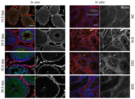 Analysis of the establishment and integrity of the blood–testis barrier throughout in vitro culture. The biotin tracer was revealed in red with Alexa fluor® 594-conjugated streptavidin. A staining with a DDX4 antibody in green was performed to detect germ cells. Nuclei were counterstained with Hoechst. The in vivo kinetics showed a progressive establishment of the BTB. The absence of a functional BTB was highlighted by the presence of the biotin tracer within the adluminal compartment of seminiferous tubules at 14.5 and 24.5 dpp. Tubules with an in-tact BTB (annotated with a star) were observed at 30.5 dpp and 36.5 dpp: in these tubules, the biotin tracer was restricted to the basal compartment. In in vitro cultured tissues, biotin permeated throughout the seminiferous epithelium in all the tubules observed, showing an impairment in the establishment of the BTB. Scale bar: 50 µm; Magnification: ×400. BTB—blood–testis barrier; dpp—days post-partum.