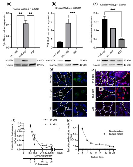 Analysis of steroidogenesis in in vitro culture. Expression of 3βHSD (a), CYP17A1 (b), and AR (c) was quantified by western blot. Tissues cultured for 28 days (D28), and tissues recovered from age-matched in vivo controls (36.5 dpp) and from immature in vivo controls (14.5 dpp) were analysed. Representative data are presented. n = 6. (d) CYP17A1 immunostaining in Leydig cells (circle). (e) AR immunostaining in Sertoli cells (triangle), peritubular cells (square), and Leydig cells (circle). Seminiferous tubules are delimited by dotted lines, and the panels on the right represent enlarged views of the boxes. Scale bar: 50 µm; Magnification: ×400. Intratesticular testosterone levels (f) and levels of testosterone in culture media (g). For statistical analyses, Kruskal–Wallis tests followed with Dunn’s post-test were applied for (a–c), and Mann–Whitney tests were applied for (f,g). Data are expressed as mean ± s.e.m. * p value < 0.05; ** p value < 0.01; *** p value < 0.001.