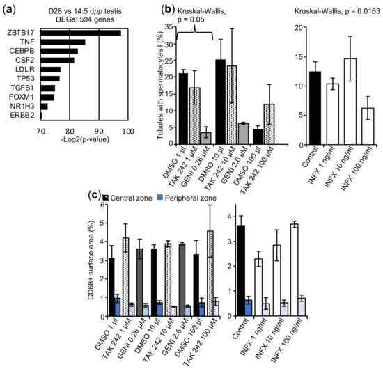 To identify a potential common regulator of these deregulated genes, the upstream regulator tool from Ingenuity Pathway Analyses (IPA) software was used. IPA analyses clearly demonstrated that zinc finger and BTB domains containing 17 (ZBTB17), tumor necrosis factor (TNF), and CCAAT/enhancer binding protein beta (CEBPB) were the top three predicted upstream regulators of the 594 deregulated genes between 14.5 dpp and D28 cultured tissues, among the 600 candidate genes (Figure 7a, Table S4). Most of the top 10 predicted upstream regulators were involved in inflammatory processes or immune cell recruitment. We hypothesized that the maturation arrest observed in vitro could be associated with a strong response of the local inflammatory system, probably generated by the resident macrophages, as previously described in cultures of mouse prepubertal testicular tissues [49]. To test this hypothesis, tissue cultures were supplemented for 28 days with anti-inflammatory molecules. The analysis of the progression of spermatogenesis shows no germ cell differentiation beyond the spermatocyte I stage, whatever the molecule added into the culture medium (Figure 7b). Moreover, none of the molecules tested were efficient in significantly increasing the percentage of seminiferous tubules containing spermatocytes I, especially genistein, which not only alters meiotic progression but also tissue architecture at the highest concentration used (Figure 7b). The molecules tested also failed to decrease the macrophage population, since the CD68+ surface area was not significantly different between the conditions (Figure 7c).