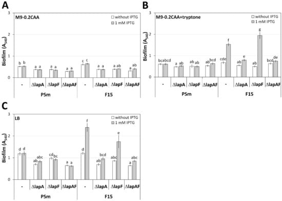 Biofilm of P. putida strains PSm, F15 and deletion-mutants ΔlapA, ΔlapF, and ΔlapAF constructed from them. “-“ indicates original strain without deletions. Cells were grown in (A) M9-0.2CAA, (B) M9-0.2CAA+tryptone, and (C) LB medium. Cells were grown with or without 1 mM IPTG. Arithmetic means of at least three independent sets of measurements are shown. The 95% confidence intervals of the arithmetic means and the homogeneous groups are shown above the columns by lower-case letters, tested by following Bonferroni’s test for unequal n. Identical letters in homogenous groups denote nonsignificant differences (p ≥ 0.05) between averages of biofilm.