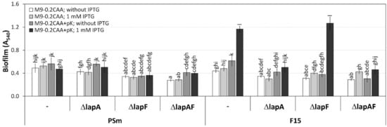 Biofilm of P. putida strains PSm, F15, and deletion-mutants ΔlapA, ΔlapF, and ΔlapAF constructed from them in the M9-0.2CAA medium with poly-L-lysine (pK) or without it. “-“ indicates original strain without deletions. Cells were grown with or without 1 mM IPTG. Arithmetic means of at least three independent sets of measurements are shown. The 95% confidence intervals of the arithmetic mean and the homogeneous groups are shown above the columns by lower-case letters, tested by following Bonferroni’s test for unequal n. Identical letters in homogenous groups denote nonsignificant differences (p ≥ 0.05) between averages of biofilm.