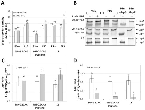 The expression of adhesins LapA and LapF in P. putida strains PSm and F15. (A) β-galactosidase activity in cells carrying pB_PlapA1-8 where lapA promoter region cloned in front of lacZ gene. Arithmetical means of at least three independent sets of measurements and 95% confidence intervals of the arithmetic mean. The homogenous groups are shown above columns by lower-case letters. Identical letters denote nonsignificant differences (p ≥ 0.05) among averages of means. (B) SDS-PAA gel electrophoresis from cell lysates prepared from cells grown in M9-0.2CAA, M9-0.2CAA+tryptone or LB medium with or without IPTG. PSmΔlapA and PSmΔlapF cell lysates were loaded onto the gel as negative controls of LapA and LapF. The arrows indicate the location of LapA and LapF. 40 mg of total protein was applied to the line. (C) Normalised LapA and (D) LapF amount. The amount of adhesine determined from the crude lysate of cells grown with IPTG was divided by the amount of LapA determined from the crude lysate of cells grown without IPTG. The averages of at least 6 biological parallels are given, with 95% confidence intervals. The homogenous groups are shown above columns by lower-case letters. Identical letters denote nonsignificant differences (p ≥ 0.05) between the averages of the ratios.