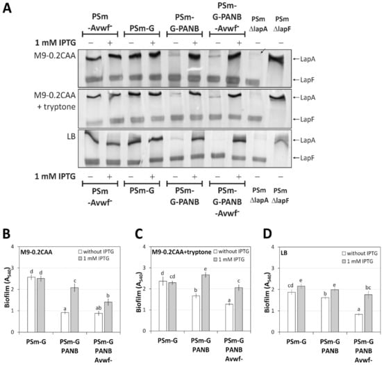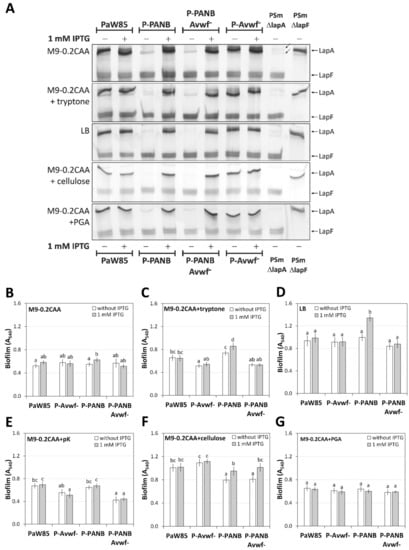The biofilm was evaluated by every medium separately. In the M9-0.2CAA medium, the biofilm of all PaW85-based strains was similar (Figure 4B). Although P-PANB forms more biofilm in the presence of IPTG than in its absence (p = 0.025), P-PANB biofilm does not differ from P-PANB-Avwf− biofilm (p > 0.108); there is no significant biological difference among the biofilms of these strains.