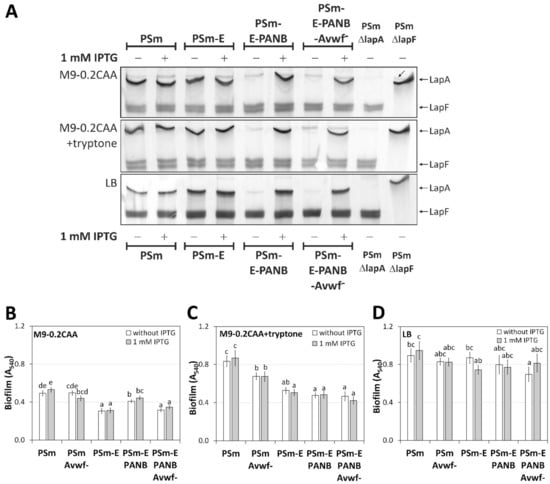 Since the transporter of LapA was incomplete in ΔlapE-based strains, we expected that manipulating the lapA expression by IPTG or deleting vWFa would not affect the biofilm in these strains. Indeed, the IPTG did not affect PSm-E-PANB and PSm-E-PANB-Avwf− biofilm in any of the used media (Figure 5B–D). However, in the M9-0.2CAA medium, for some reason that we cannot explain, the vWFa deletion reduced 1.3 times PSm-E-PANB biofilm (p < 0.001; Figure 5B).