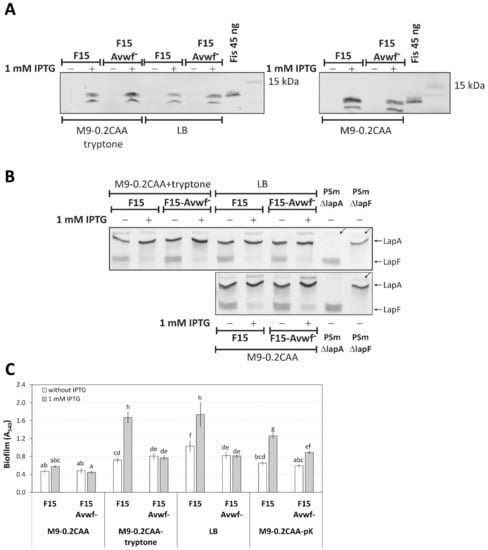 The fis-overexpression in F15 and F15-Avwf− strains by IPTG was assessed in M9-0.2CAA, M9-0.2CAA+tryptone and LB media (Figure 7A). The expression of fis was similar in both strains in all media tested, and IPTG induced the expression of fis from the Ptac promoter in these strains (Figure 7A). After that, the LapA presence in the crude cell lysates of F15-Avwf− strains was assessed (Figure 7B). The ratio of LapA in cells grown in the presence of 1 mM IPTG versus without IPTG was similar to F15; 1.21 (95% confidence interval of arithmetical mean 0.60) in M9-0.2CAA, 2.04 (1.48) in M9-0.2CAA+tryptone and 1.58 (1.22) in LB medium. Although the differences in LapA ratios of F15-Avwf− were statistically insignificant in the media assessed, LapA ratios increased similarly to F15 when IPTG and tryptone were added to the media (Figure 3C).