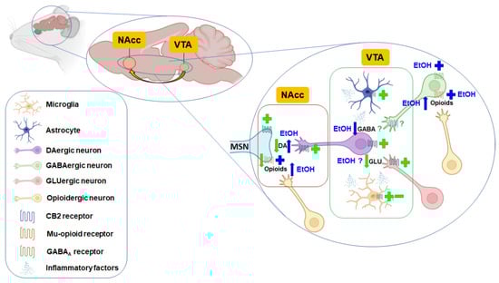 Although, the functions of the immune system in defensive and repair of damage and exposure to pathogens are well established, its involvement in the regulation of brain functions, such as long-term potentiation (LTP), memory, synaptic plasticity [,], and emotional regulation [], has been elucidated only recently. These physiological functions are closely related to pathways associated with the reward system and alcohol disorders.