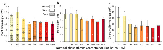 Plant growth parameters measured from poplar after four weeks of growth in a soil spiked with increasing phenanthrene concentrations. (a) Total biomass of leaf, stem and root compartments. (b) Stem height measurement. (c) Chlorophyll content in leaves measured with Dualex FORCE-A. The data represent the means of three to four plant replicates per condition and error bars represent standard deviation. When present, different letters indicate significant differences (p < 0.05) between conditions after one-way ANOVA (Analysis of variance) and Tukey’s post-hoc analysis, except for the leaf biomass, which was analysed by Kruskal-Wallis and Dunn post-hoc tests. For other parameters (leaf number, flavonols, anthocyanins and Nitrogen Balance Index), please refer to Table S1.