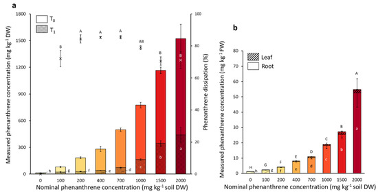 Measured phenanthrene concentrations in soil (a) and in poplar tissues (b). Each plot represents the mean data of four plant replicates cultivated at a different phenanthrene concentration. The T0 values were measured right after spiking the soil and before the addition of the plant to the pot. The T1 values were measured after four weeks of plant growth. The bars represent the standard deviation to the mean. Different letters indicate significant differences (p < 0.05) between the nominal phenanthrene concentrations after Kruskal-Wallis and Dunn post-hoc tests.